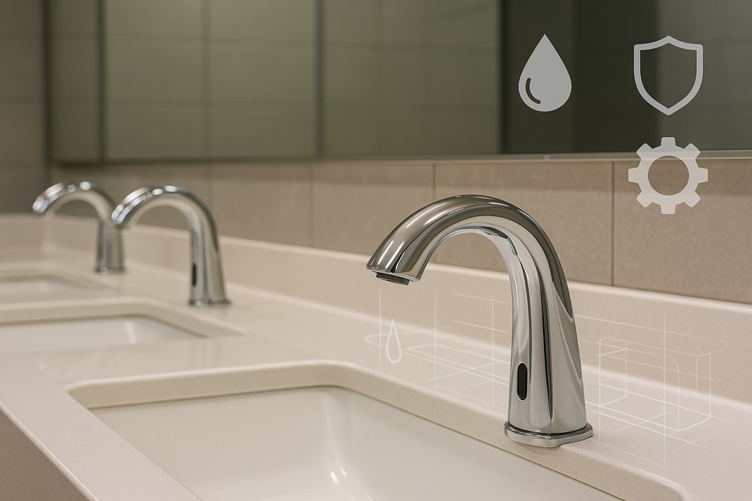 - Touchless commercial bathroom faucets with concealed mounting hardware and solid metal bodies, consistent with water-efficient commercial restroom products and similar lines.